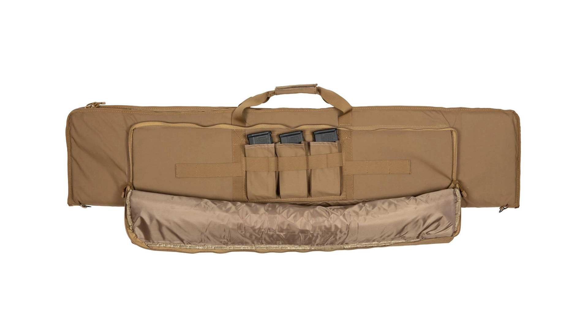 Eine zusätzliche Fronttasche mit den Maßen ca. 900 × 220 mm bietet erweiterten Stauraum. In diesem Fach befinden sich drei integrierte Doppeltaschen für insgesamt bis zu sechs Magazine sowie elastische Haltebänder zur Fixierung von weiterem Zubehör.