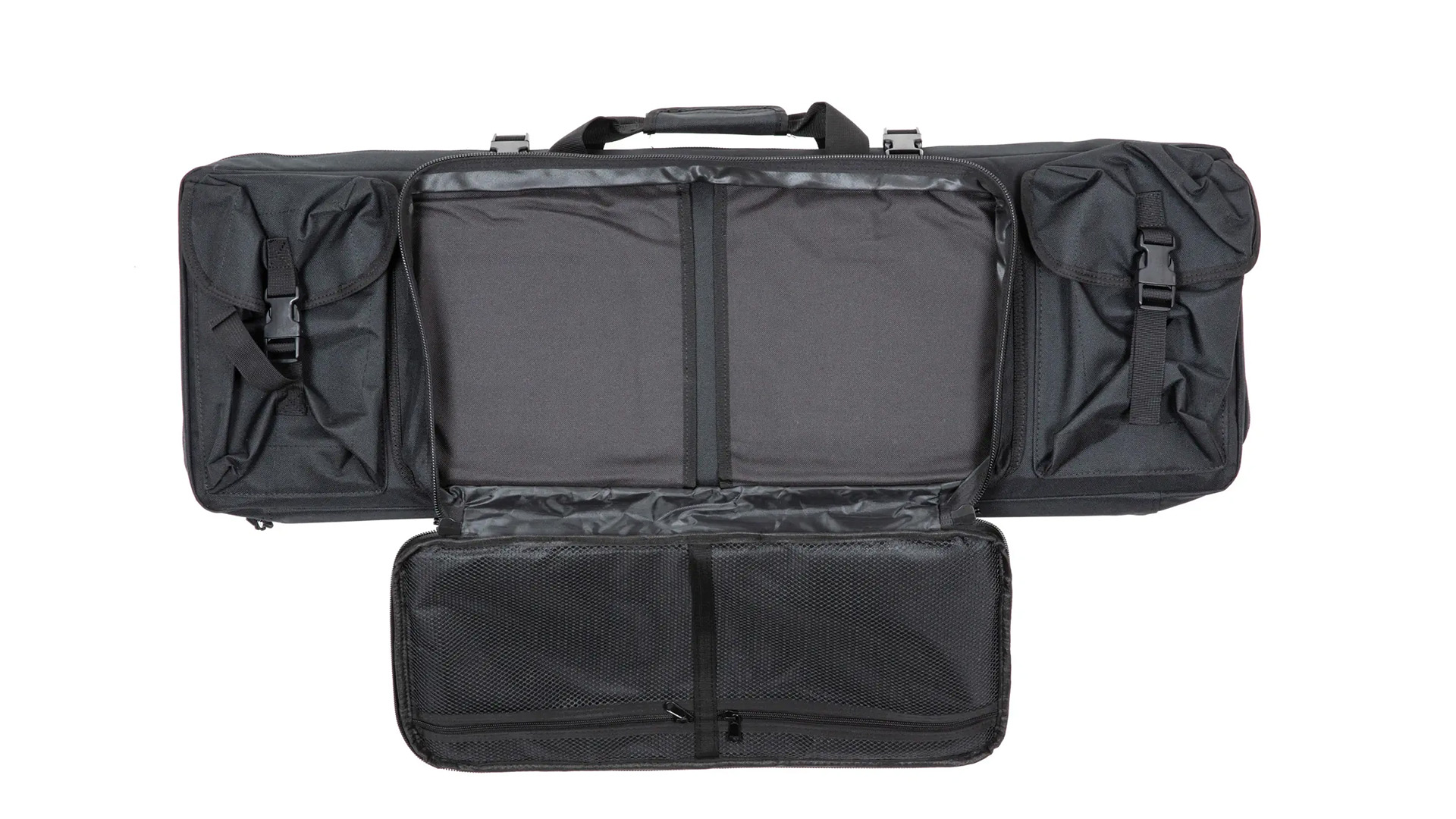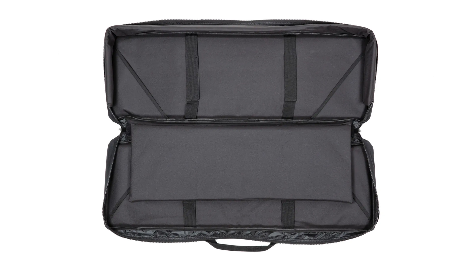 Die Tasche verfügt über zwei getrennte Hauptbereiche. Das große Hauptfach mit Innenmaßen von 87 x 30 x 8 cm ist mit Fixiergurten ausgestattet, um Repliken sicher zu immobilisieren. Gepolsterte, verstärkte Innenwände schützen vor mechanischen Beschädigungen. Eine herausnehmbare Trennwand ermöglicht die sichere Separierung von zwei Repliken oder – bei größeren Modellen wie LMGs – die Nutzung des gesamten Volumens ohne Unterteilung.