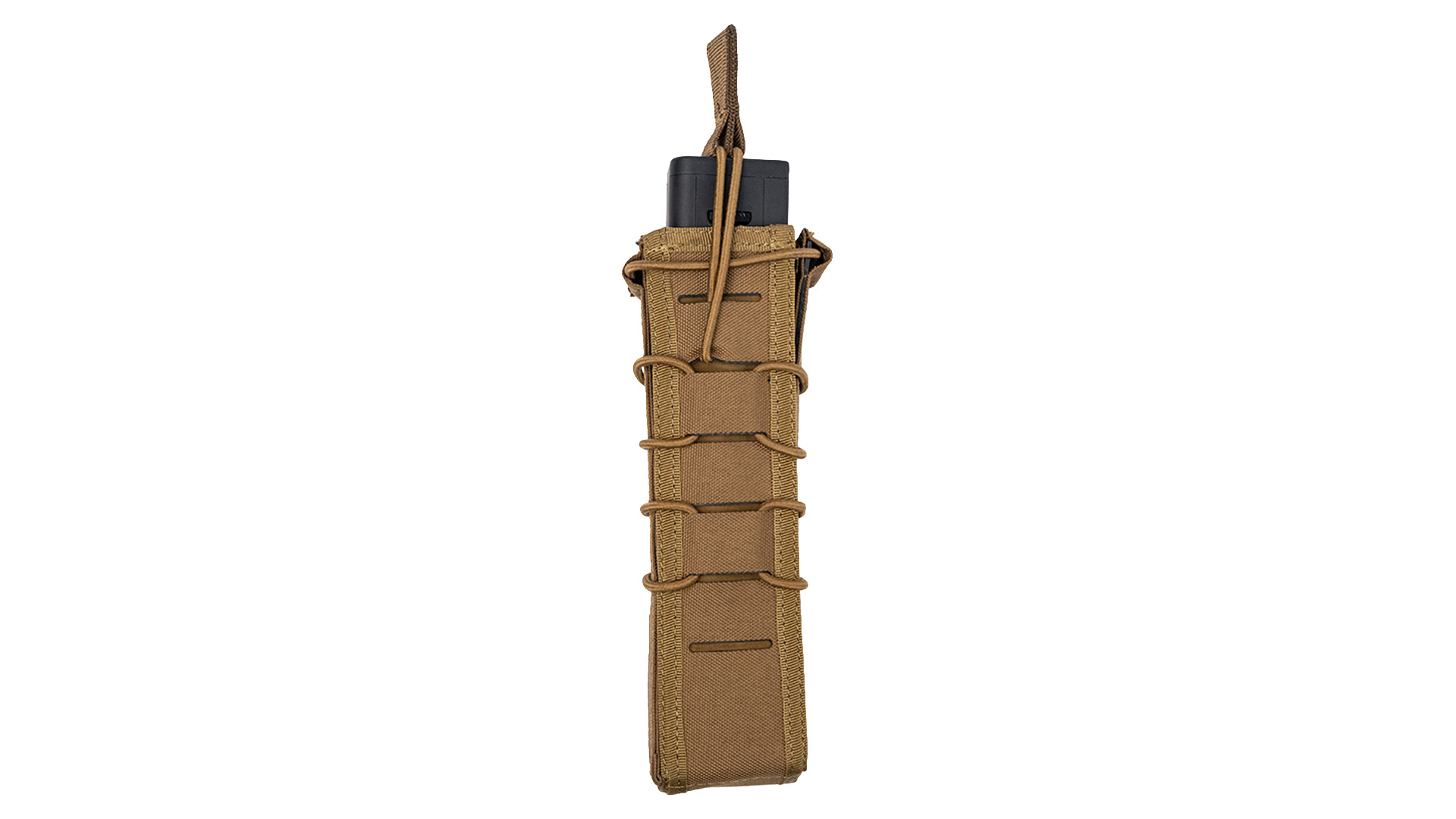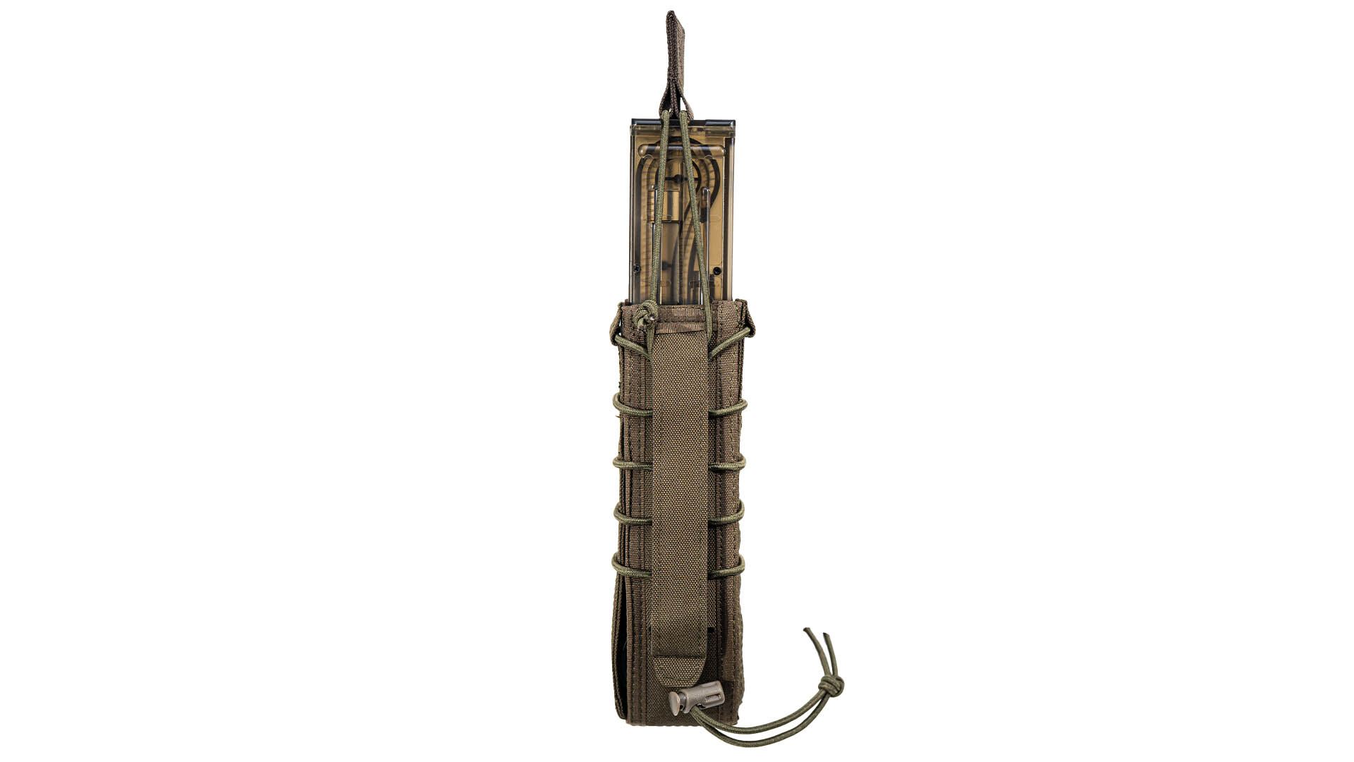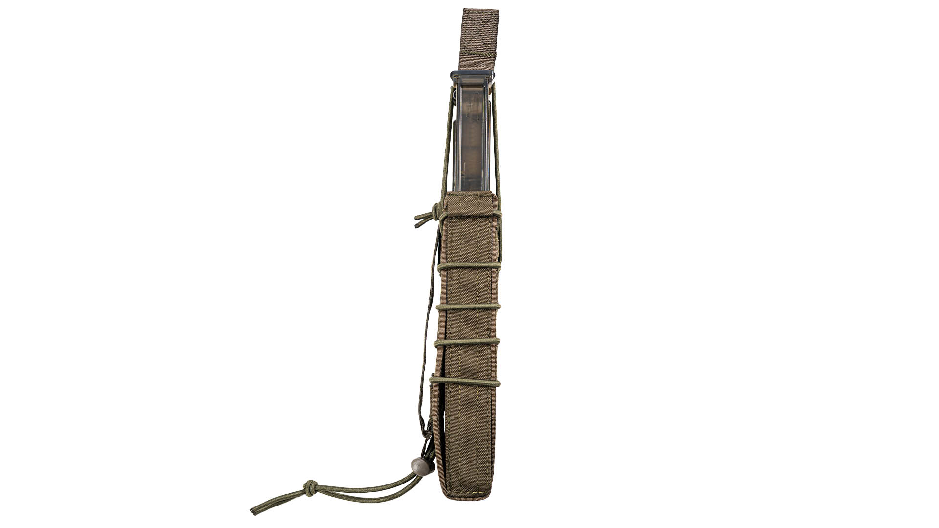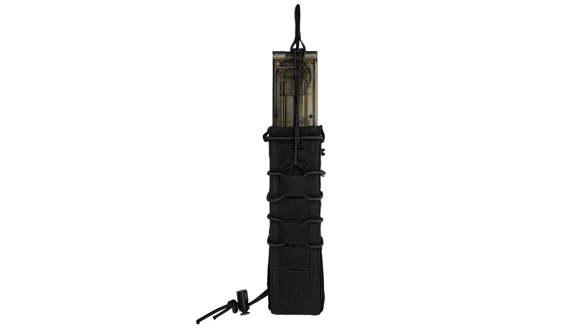 Ein elastisches Sicherungsband hält das Magazin zuverlässig an Ort und Stelle, während der seitlich integrierte Gummizug die Breite der Pouch flexibel an das eingesetzte Magazin anpasst. So sitzt jedes Magazin fest, ohne zu wackeln – und bleibt zugleich leicht zu entnehmen.