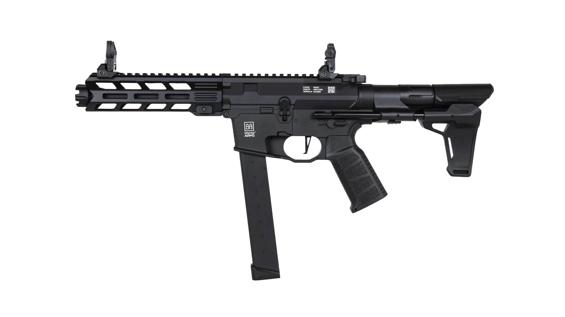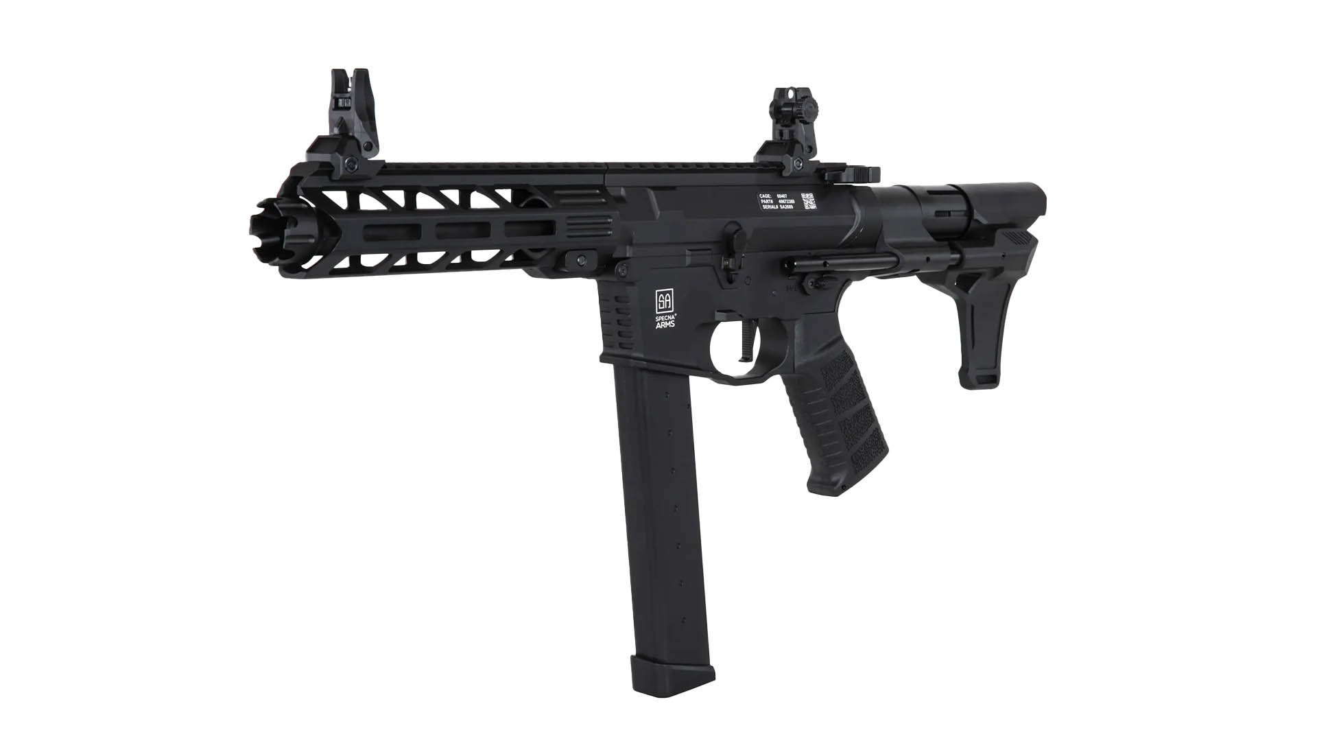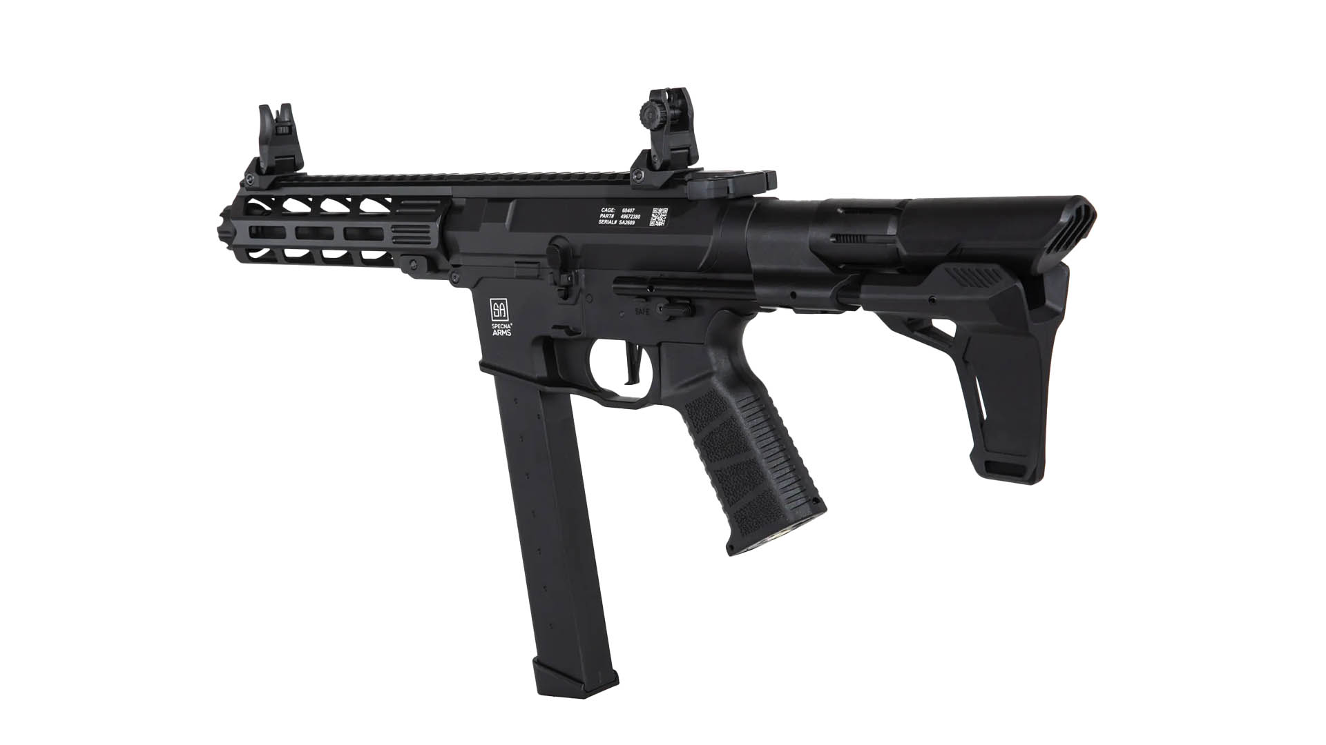 Gefertigt aus robustem Metall bietet es hohe Ergonomie, zuverlässige Funktion auch im CQB-Einsatz und einfache Wartungsmöglichkeiten durch Quick-Spring-Change-System. Es ist kompatibel mit AR-15/ M4-basierten Zubehörteilen und verfügt über ein 14 mm CCW-Gewinde am Lauf.