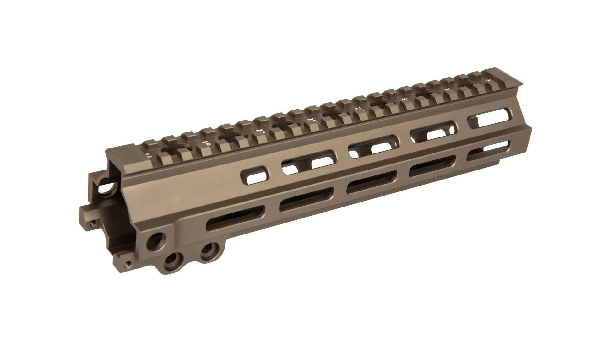 Gefertigt aus robustem Aluminium bietet das Rail-System eine Kombination aus M-LOK-Schnittstellen und einer 22 mm RIS-Oberseite zur Montage von Optiken und Zubehör. Es ist kompatibel mit gängigen M4/M16-Plattformen.