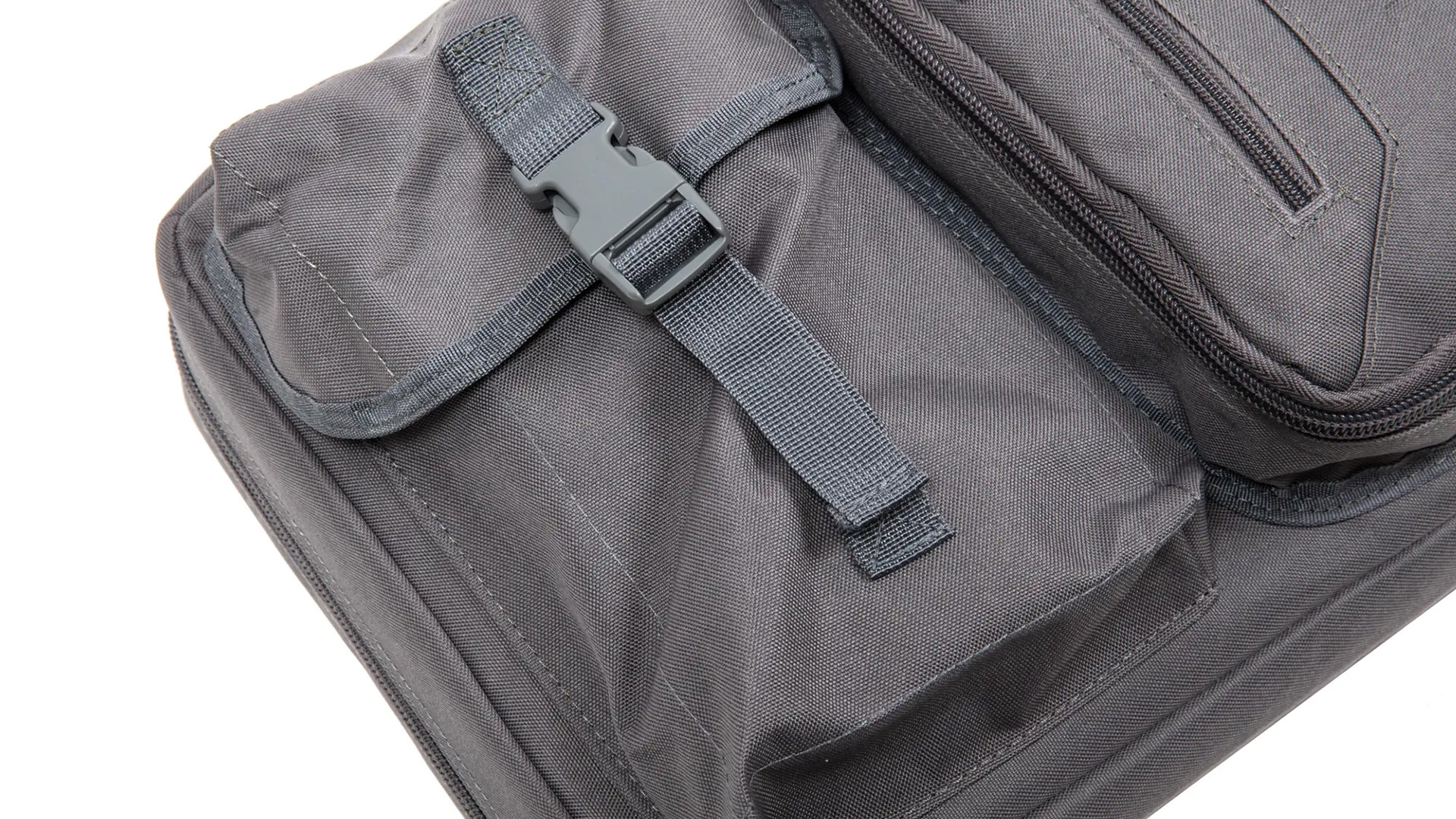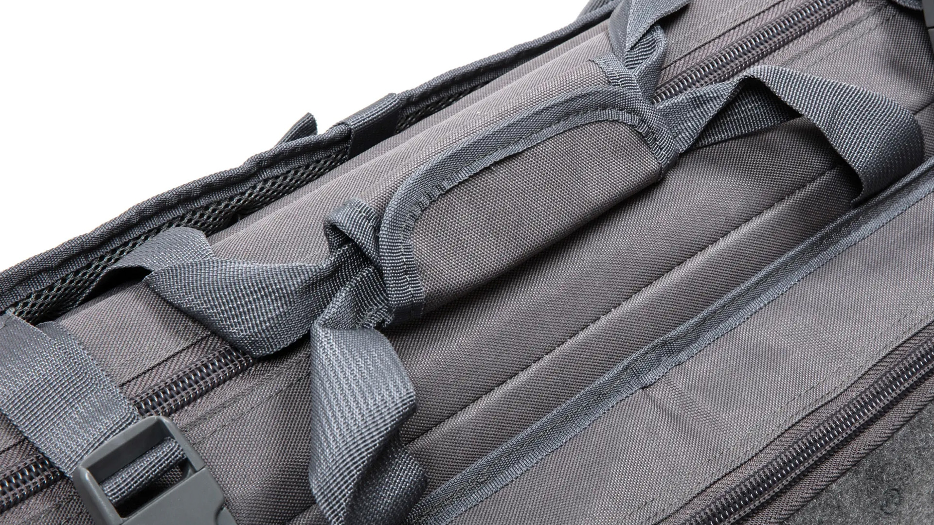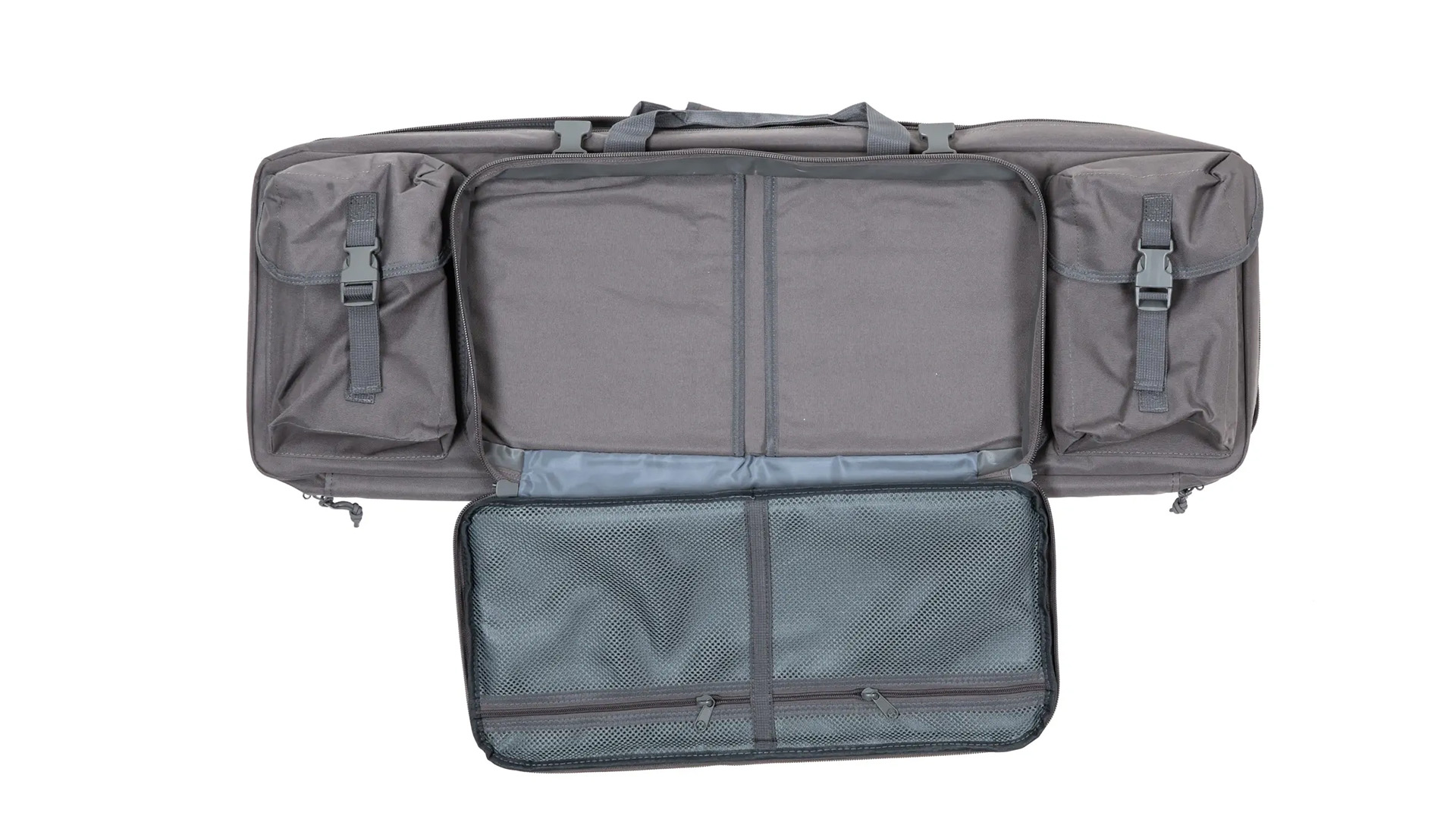 Die Tasche verfügt über zwei Hauptfächer. Das große Hauptfach mit Innenmaßen von 87 x 30 x 8 cm ist mit Fixiergurten zur sicheren Arretierung der Repliken ausgestattet. Verstärkte, weich gepolsterte Innenwände schützen vor mechanischen Beschädigungen. Eine herausnehmbare Trennwand ermöglicht entweder die sichere Separierung von zwei Repliken oder die Nutzung als erweitertes Fach für größere Modelle wie LMGs.