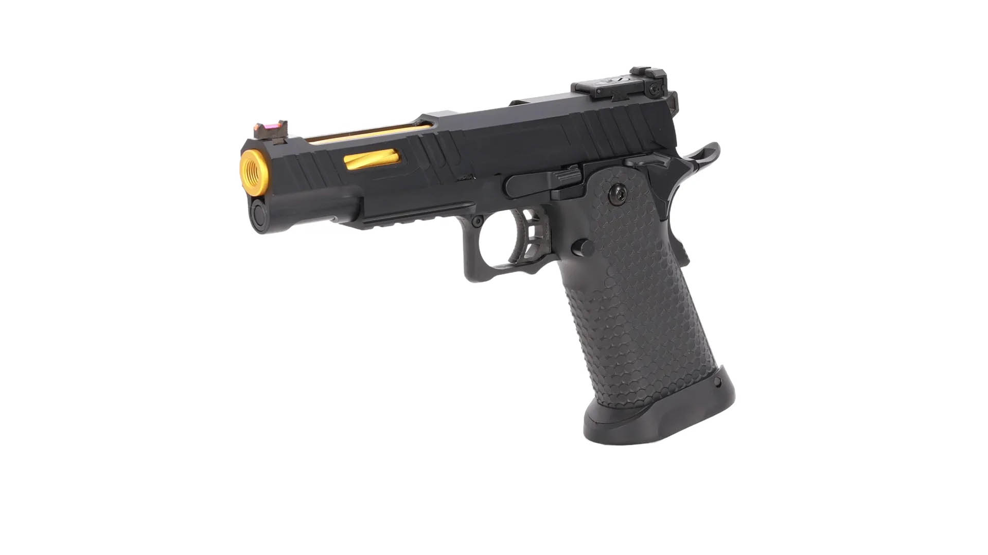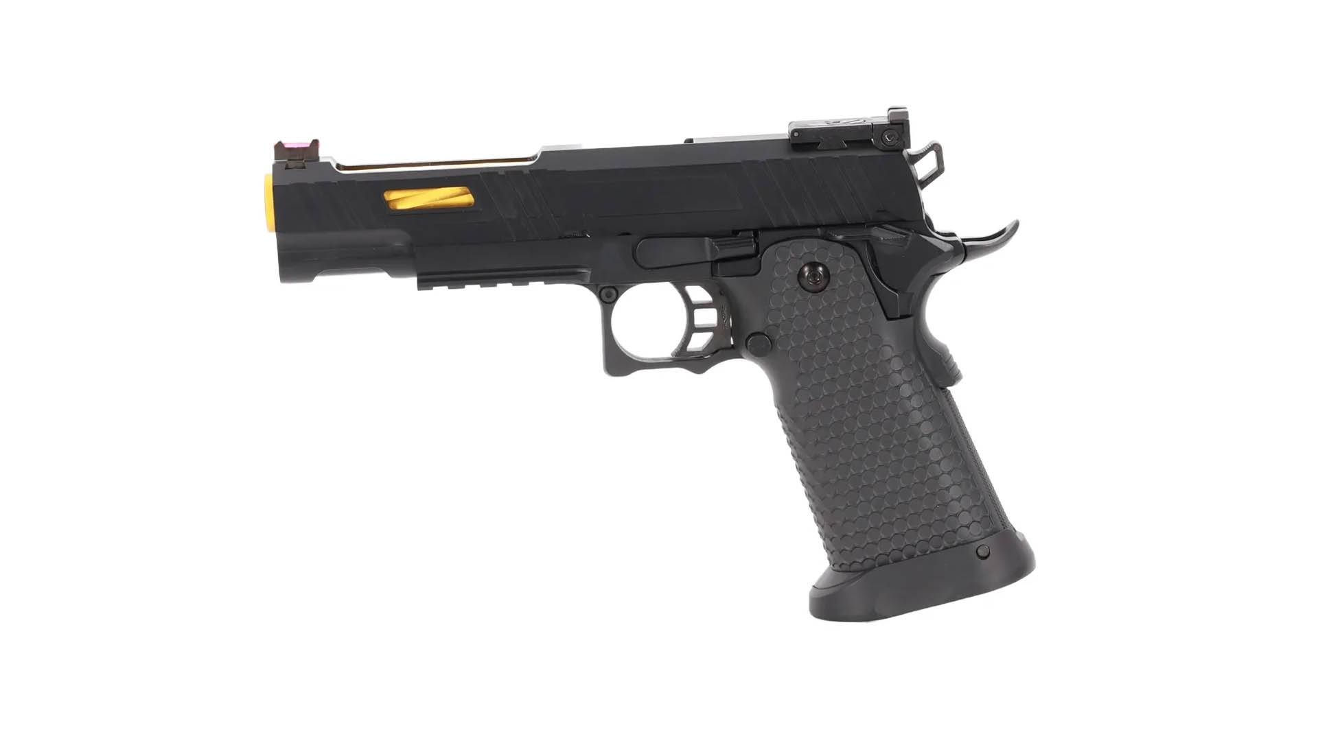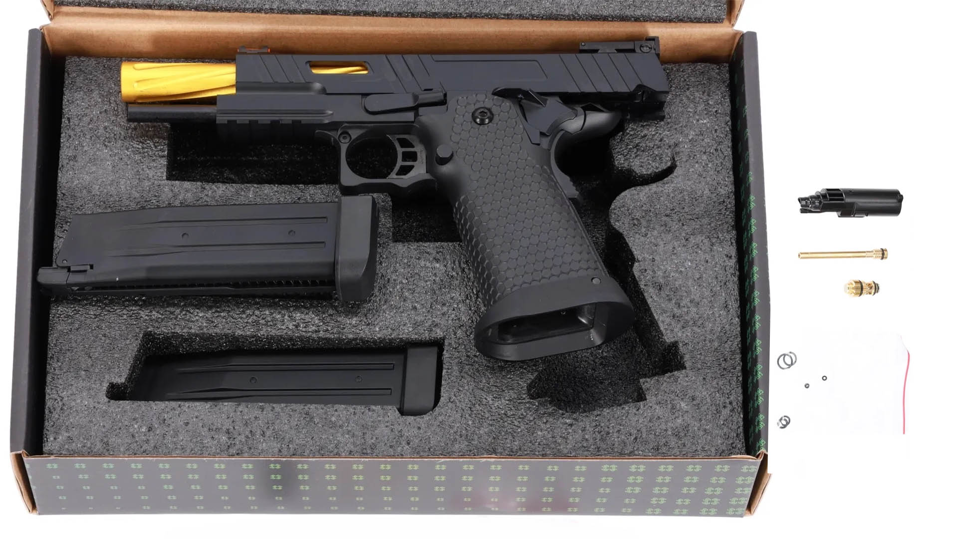• Besondere Eigenschaften: Schlittenfang nach letztem Schuss, goldfarbener Außenlauf, zweite Magazin im Lieferumfang