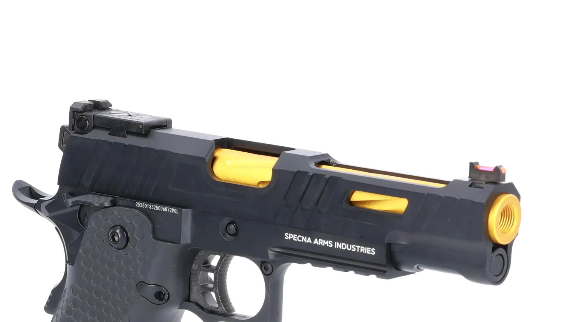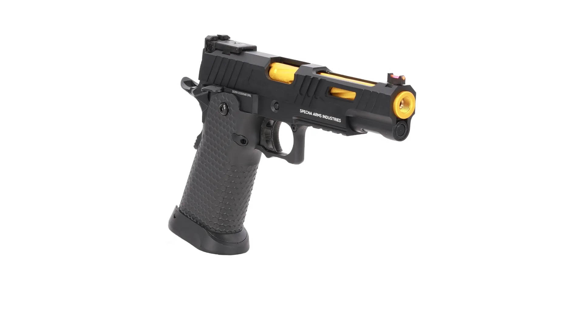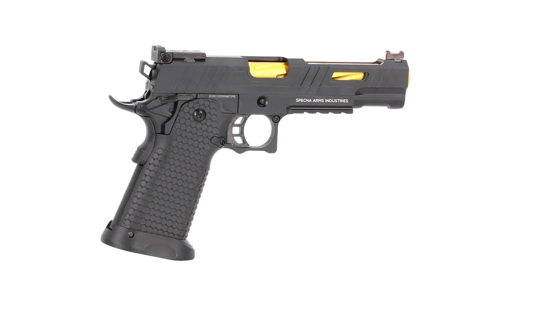 Die Specna Arms SA-VGP09 VAPOR™ ist eine gasbetriebene Airsoft-Pistole für CQB- und Spielfeldanwendungen. Sie kombiniert eine markante Optik mit solider Metallkonstruktion und realistischem Handling. Das Modell ist auf zuverlässige Funktion, ergonomische Handhabung und ein authentisches Schießerlebnis im Semi-Betrieb ausgelegt.