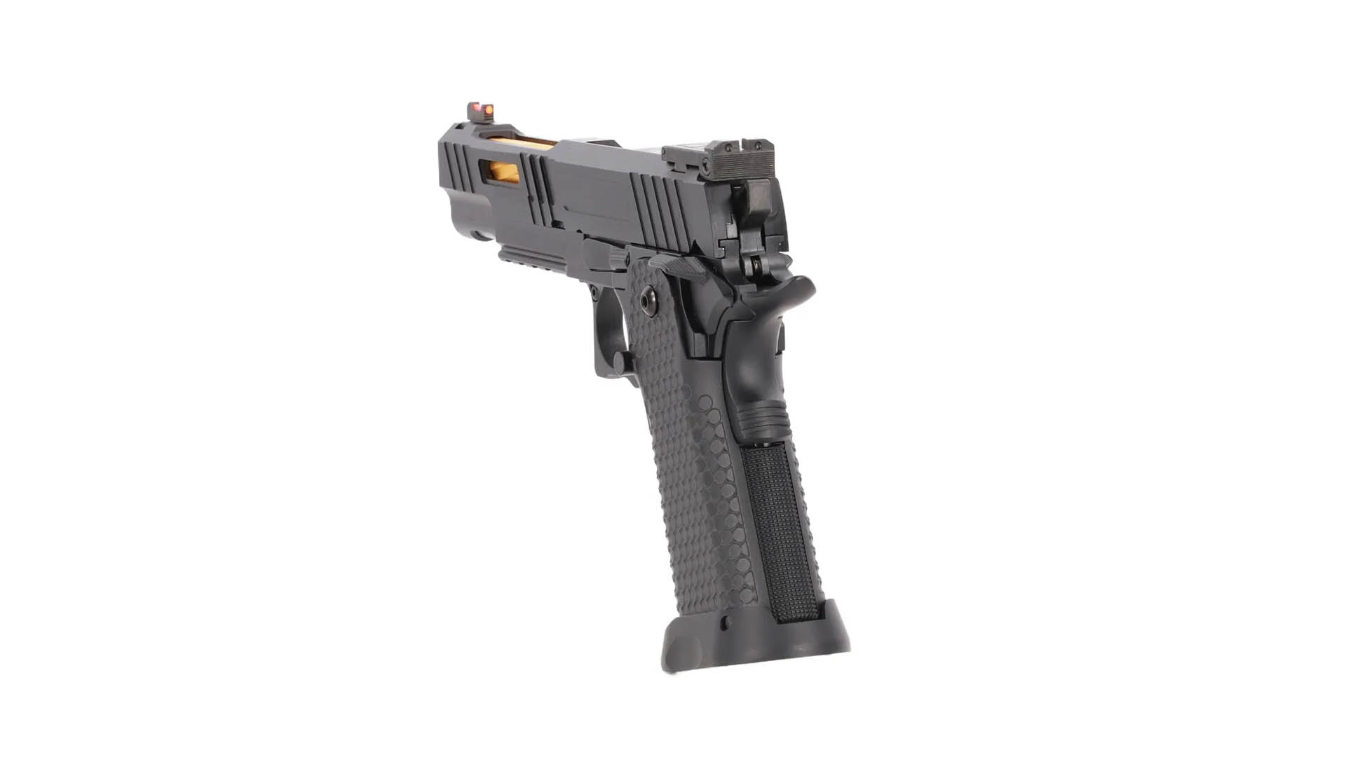 • Features: Green Gas Betrieb, Blow-Back, Flügelsicherung, Griffsicherung, strukturierter Griff, Montageschiene, offene Visierung mit Fiber-Optik