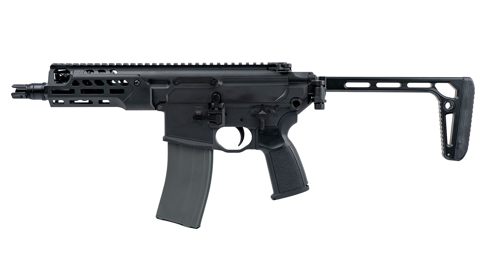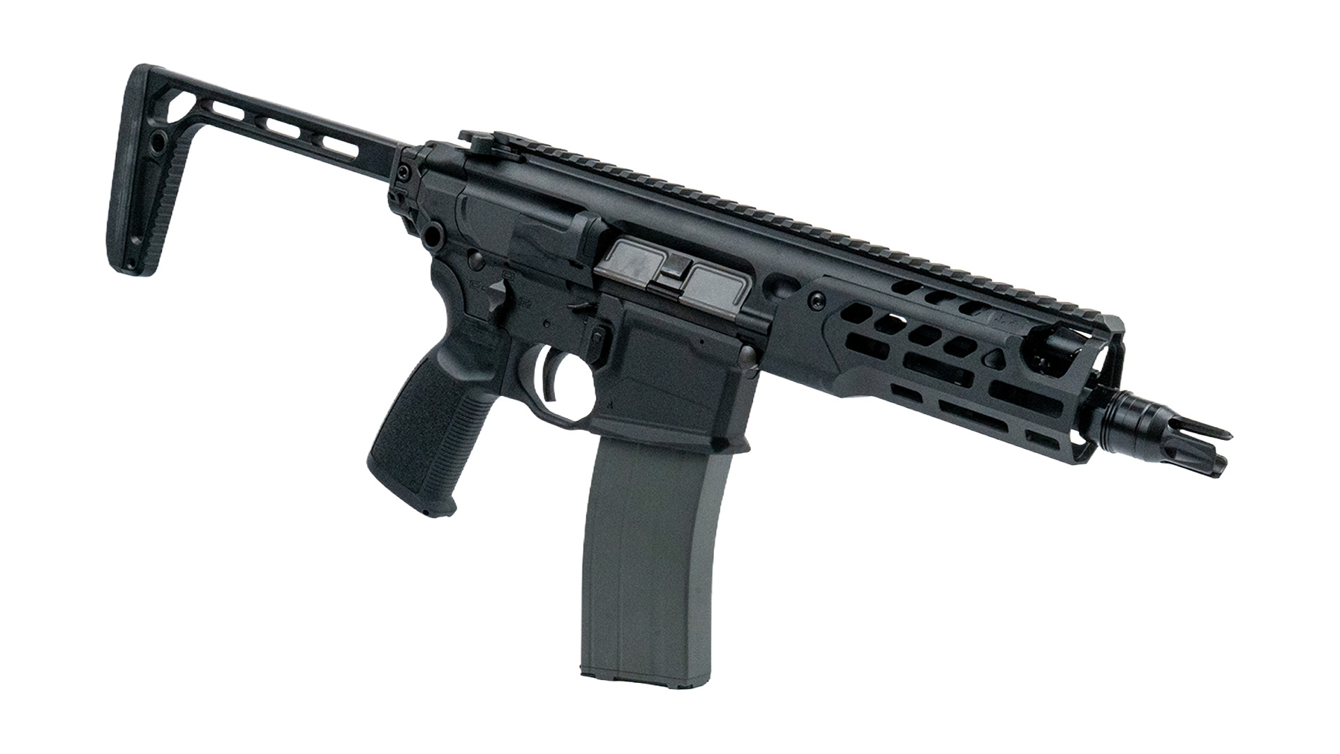 Upper Receiver und M-LOK Handschutz bestehen aus CNC-gefrästem Aluminium, während wichtige Bedienelemente wie Bolt Catch und Fire Control aus Stahl gefertigt sind. Der CNC-gefräste Klappschaft sorgt für ein sehr kompaktes Transportmaß.