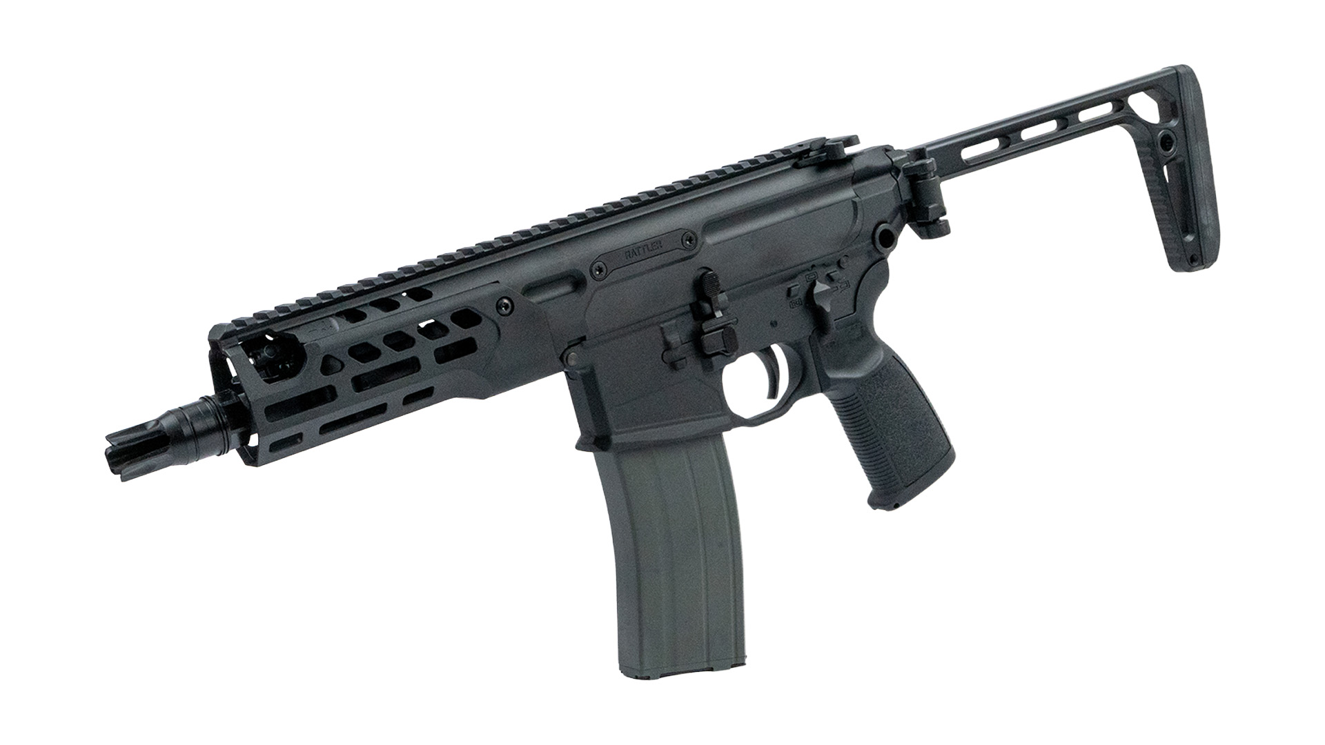 Die APFG MCX Rattler LT GBBR ist eine ultrakompakte Gas-Blowback-Airsoftplattform, die sich am modernen MCX-Design orientiert. Die LT-Version unterscheidet sich von der ersten Rattler durch den verschraubten Handschutz, ähnlich der aktuellen SPEAR LT Modelle.