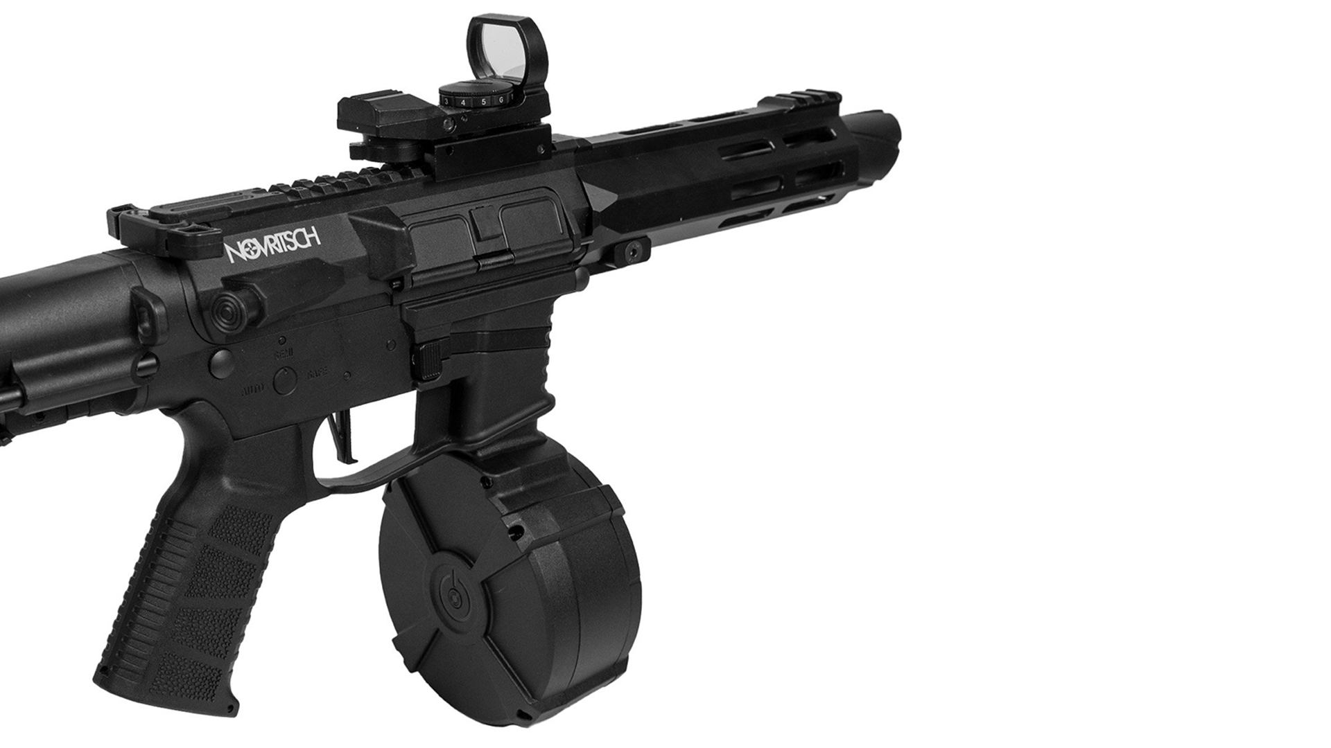 Dank integriertem Auto-Winding-Mechanismus entfällt das manuelle Aufziehen. Das Magazin aktiviert sich selbstständig über einen Drucksensor und sorgt so für eine kontinuierliche BB-Zuführung. Alternativ kann der Aufziehvorgang auch manuell über die Taste auf der Rückseite ausgelöst werden.