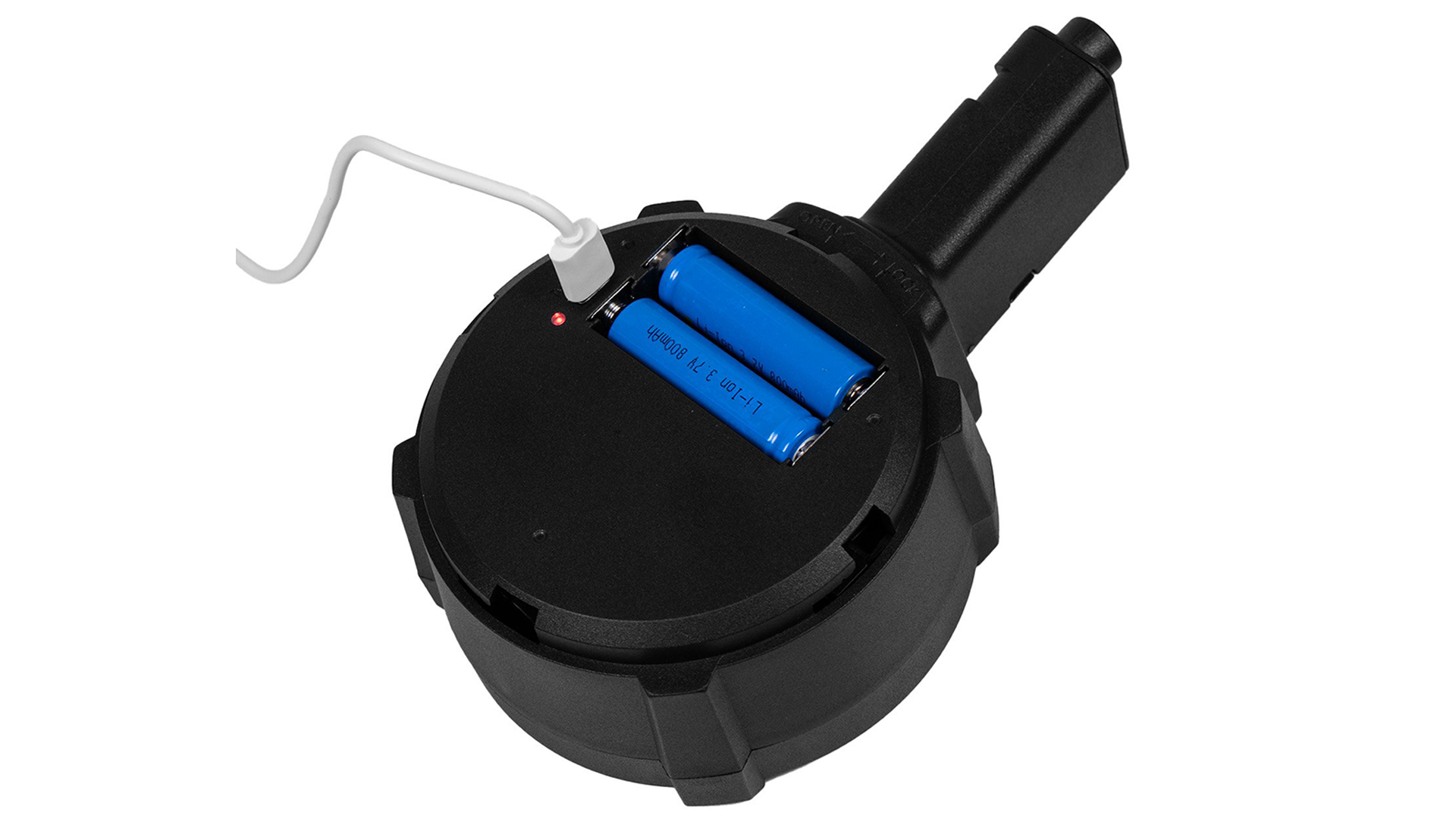 Die Stromversorgung erfolgt über zwei wiederaufladbare 14500 3,7V Akkus (nicht im Lieferumfang enthalten). Herkömmliche AA-Batterien sind nicht kompatibel. Das Laden erfolgt über den integrierten USB-C-Anschluss, ein passendes Kabel ist im Lieferumfang enthalten.