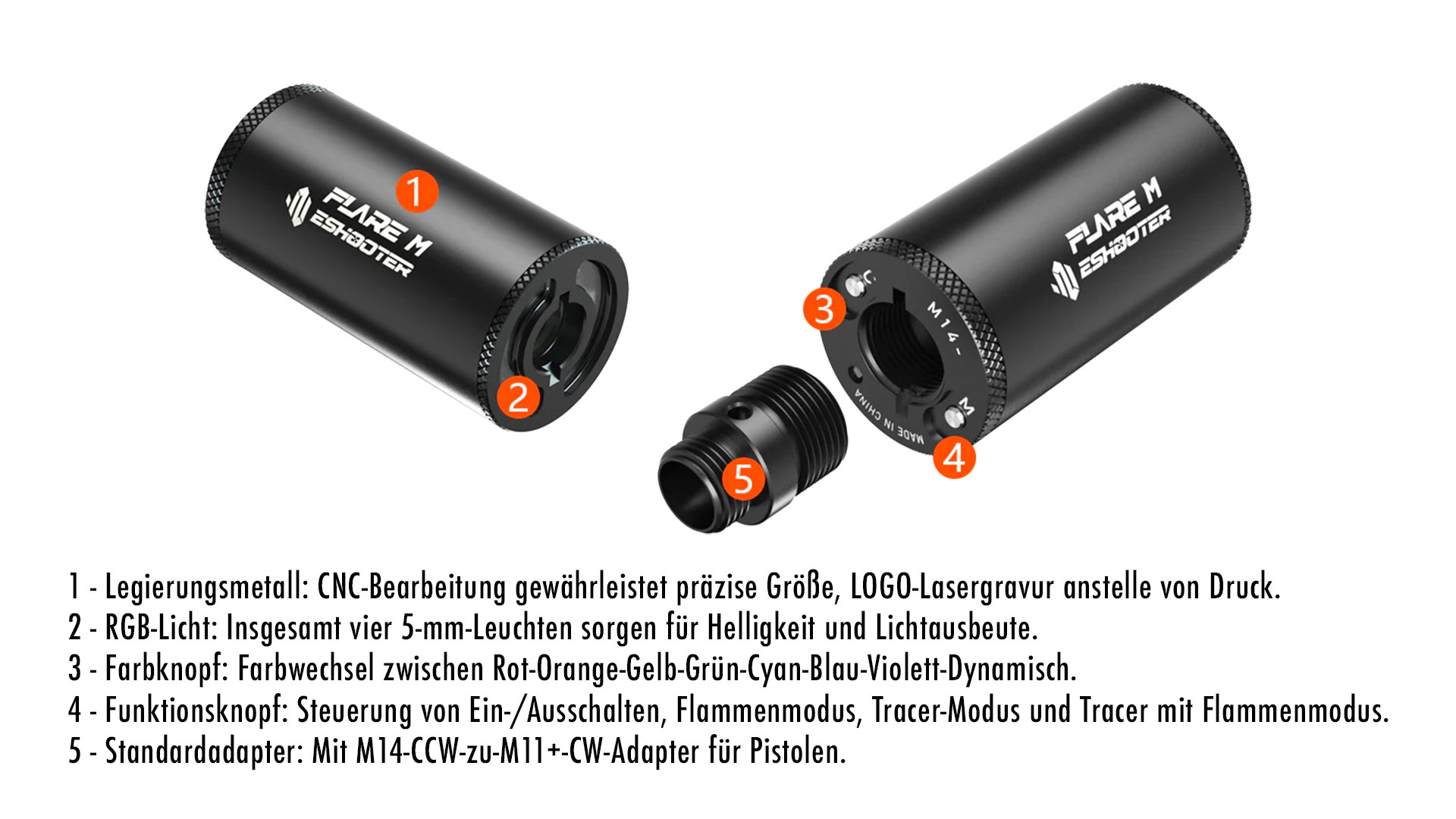 Für maximale Kompatibilität wird ein M14 CCW auf M11+CW Adapter mitgeliefert, sodass sich der Tracer sowohl an vielen Airsoft-Gewehren als auch Pistolen verwenden lässt.