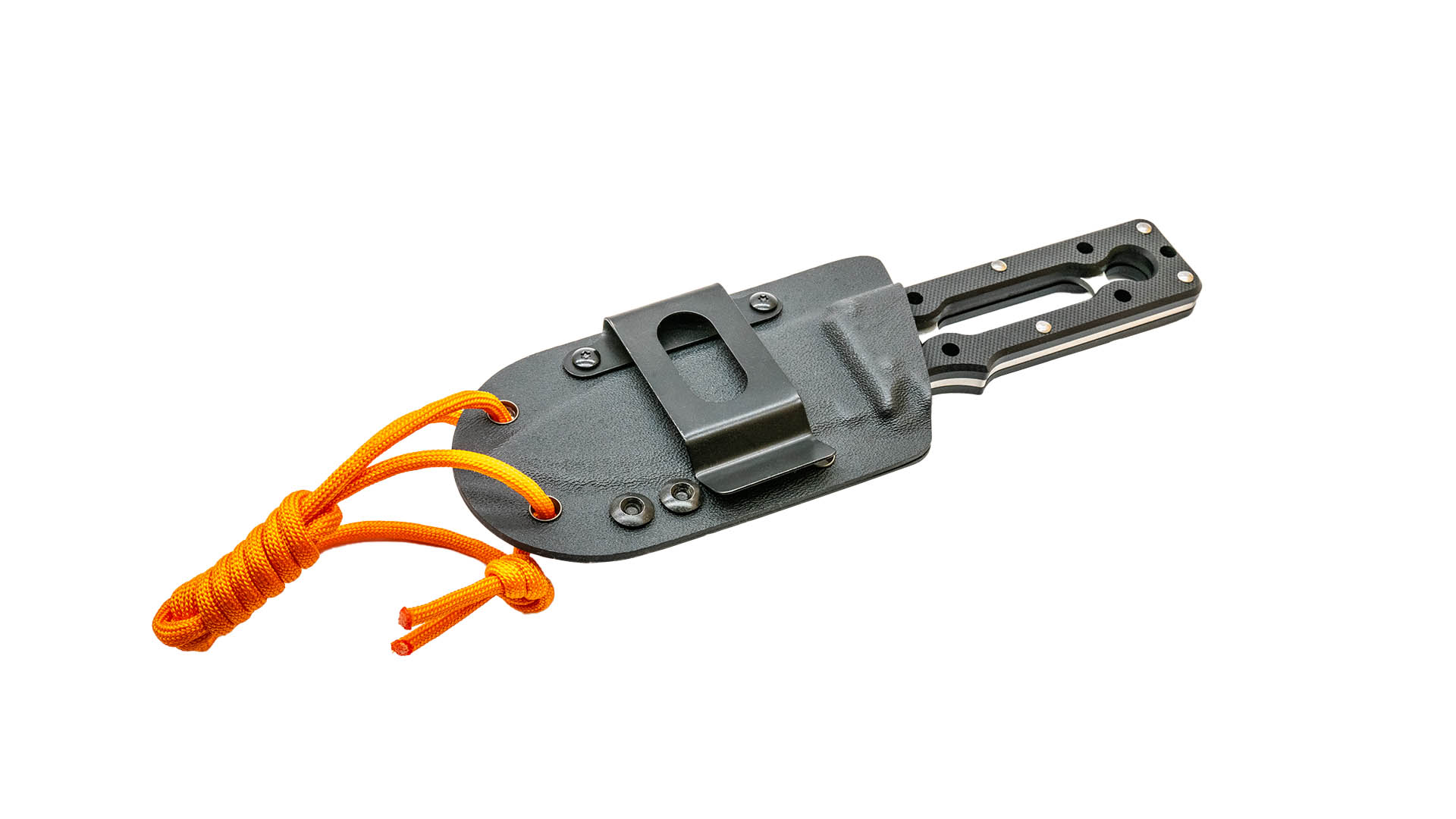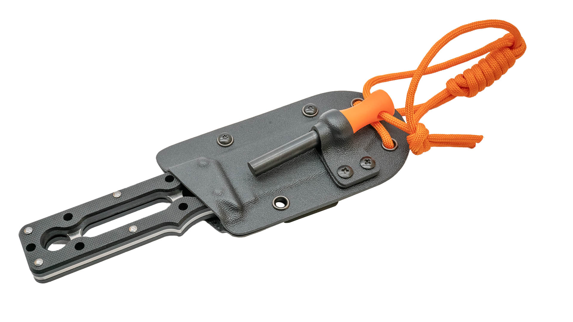 - Features: Integrierter Feuerstahl, Kydex Scheide, Paracord in Signal-Orange