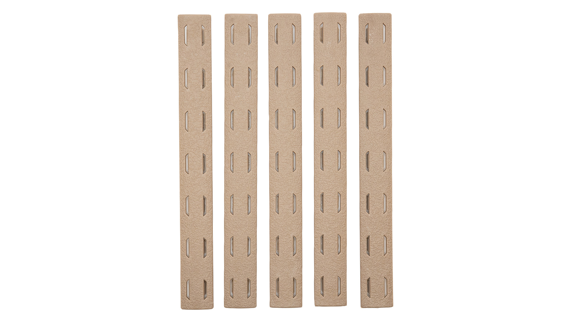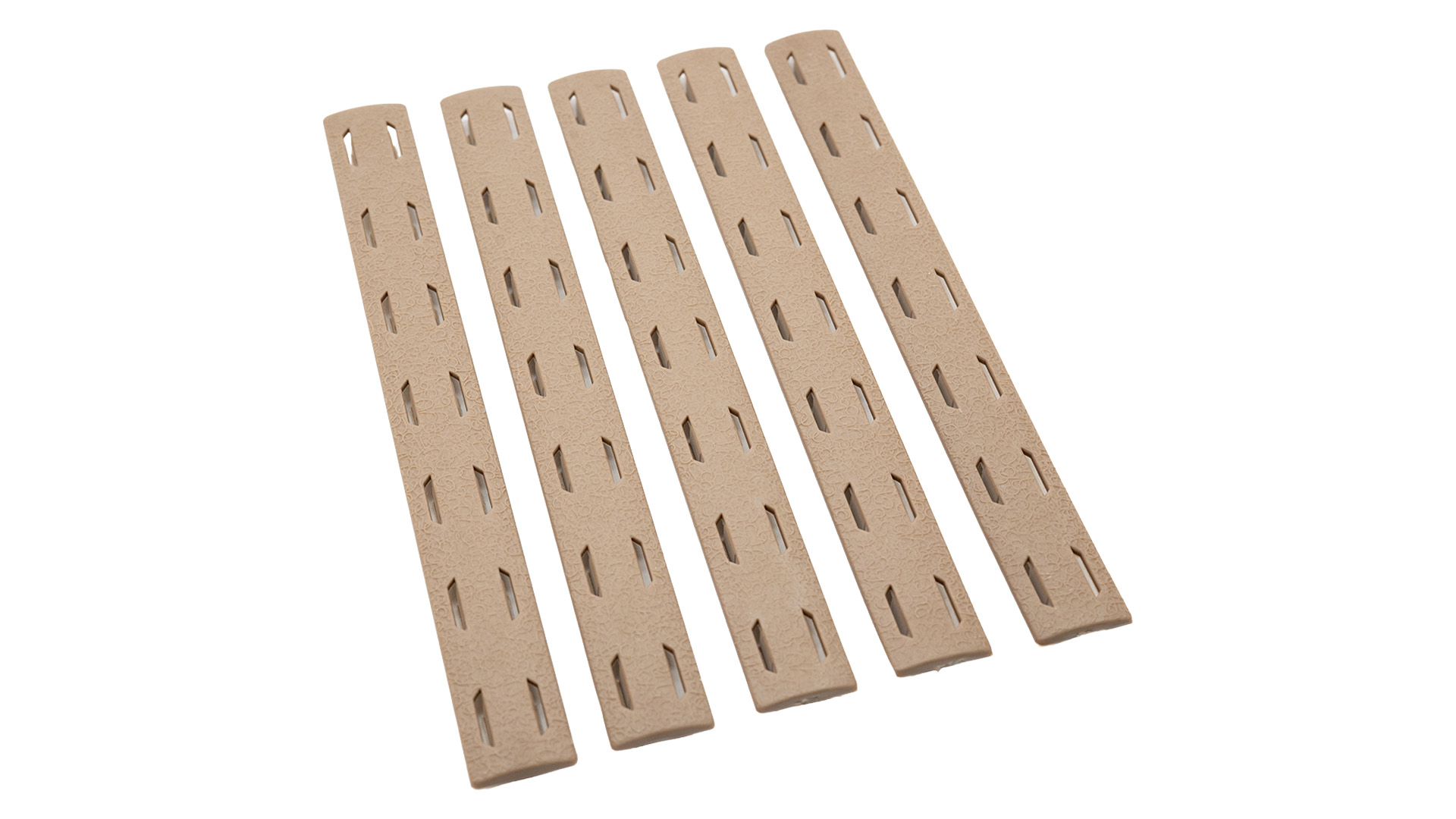 Das M-LOK Rail Panel Kit besteht aus fünf Rail Panels mit einer Länge von jeweils ca. 5,5 cm. Sie dienen zur Abdeckung freier M-LOK-Slots an Front- oder Handschutzsystemen.