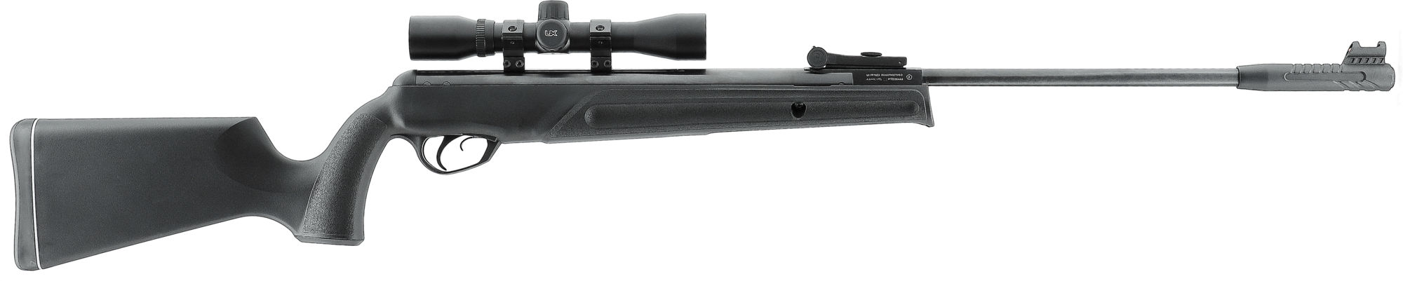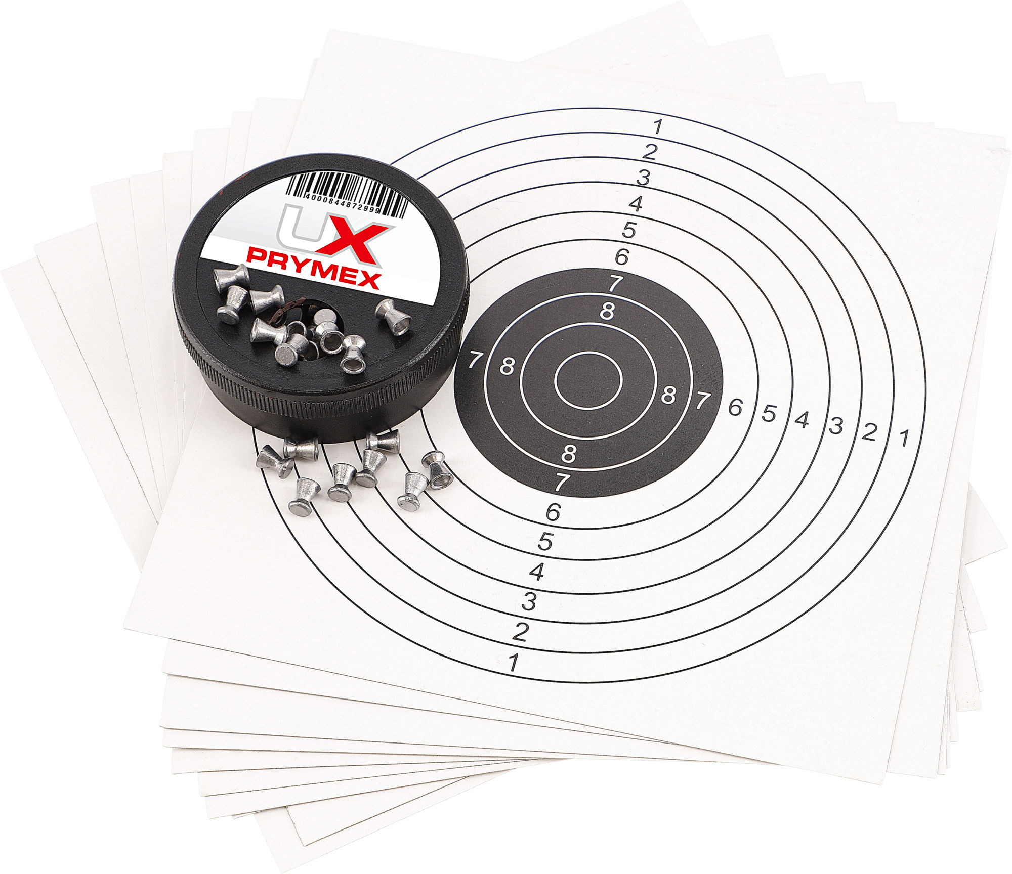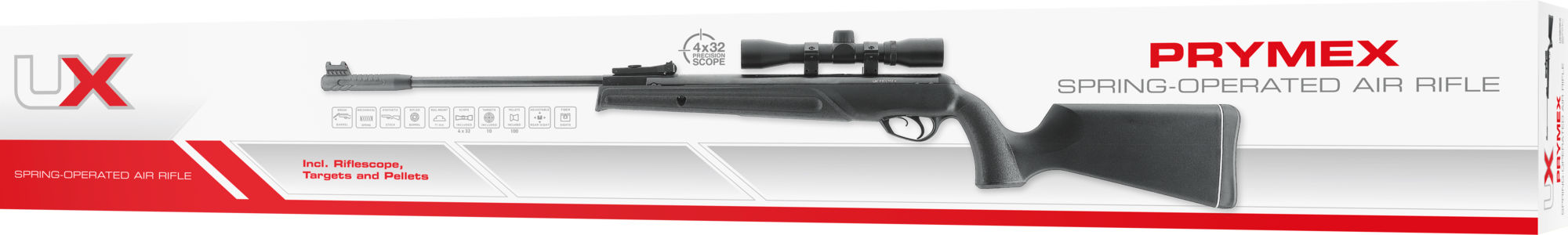 Die UX Prymex ist ein klassisches Federdruck-Luftgewehr im Set, das einen einfachen und kostengünstigen Einstieg in die Welt der Druckluftwaffen ermöglicht. Gefertigt aus robustem Polymer mit Metallkomponenten, überzeugt es durch geringes Gewicht, Zuverlässigkeit und eine ergonomische Handhabung. Der präzise gezogene 480 mm Lauf im Kaliber 4,5 mm (.177) sorgt in Kombination mit der höhen- und seitenverstellbaren Fiberoptik-Visierung für eine saubere Zielerfassung und konstante Trefferbilder.