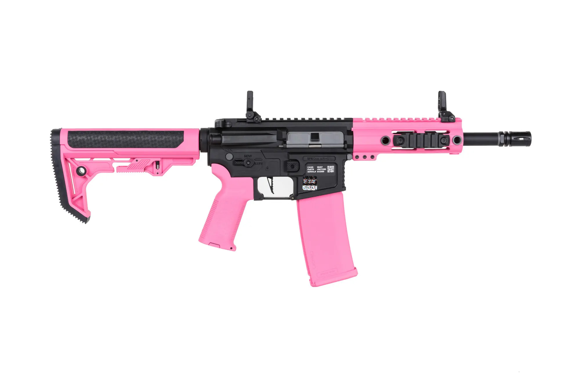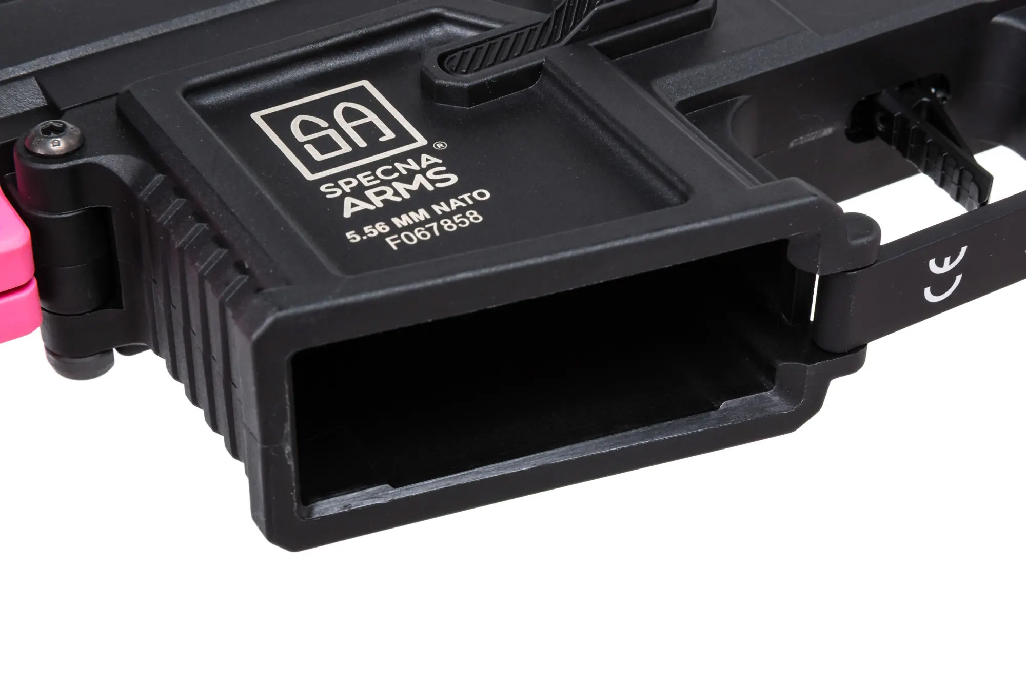 Die Specna Arms SA-04 Flex Gen.2 Karabiner – Pink ist ein Airsoft-Carbine, das durch präzise Trefferleistung, modulare Flexibilität und innovative HAL™-Elektronik überzeugt. Gefertigt aus nylonfaserverstärktem Polymer und Metall, bietet es hohe Strapazierfähigkeit bei geringem Gewicht und ist kompatibel mit M4/416-Serie Airsoft-Komponenten. Dank des HAL™-Systems mit Magnetsensor-Abzug, einstellbarer Abzugsempfindlichkeit, bürstenlosem Specna Arms Dark Matter™ High Speed 27k Motor und ESA™ Schnellwechsel-Federsystem eignet sich dieses Produkt ideal für Spieler, die Wert auf Performance, Vielseitigkeit und einfache Anpassung legen.